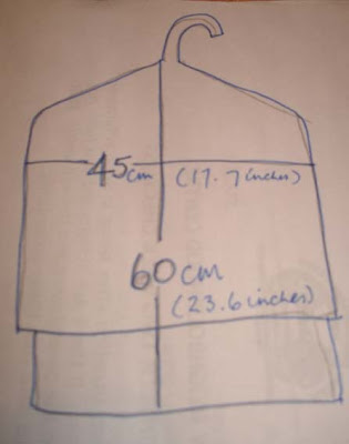 I made a larger version of this bag. The measurements of the larger bag are in the photo below. You'll probably need a flap on the front instead of just an opening as the rags will make the bag gape open. Use your clothes hanger as a guide when cutting out the shape at the top. The rest is just straight sides.